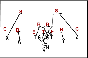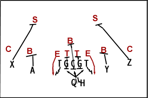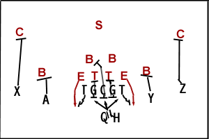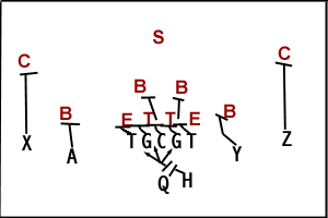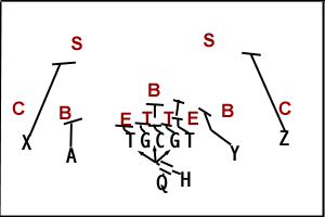 The last note, and I have mentioned this, is that we will do a formation or personel group(depending who our best blocking types are) and it will look just like our doubles formation except our slots will be in a 2 point stance with their feet parrallel, in a football stance, one yard outside the tackle and one yard back. All the rules stay the same, but it gives us a chance to substitute bigger people and better blockers if they aren't already out there and gives us more of a power set.