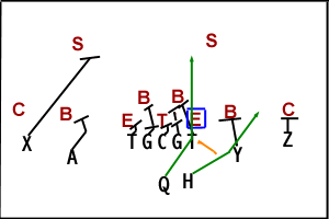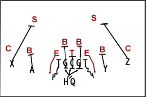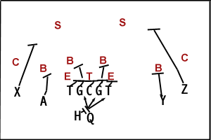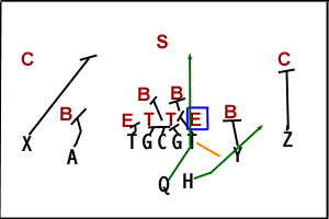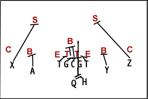 The playside defensive end is the player we are optioning, and as a result the playside tackle and guard will block down on the next closest interior defender, usually the defensive tackle, and the tackle will combo to backer. Versus the odd front diagrammed above it takes on a slightly different personality, but the rules mostly remain the same. The center, guard and tackle will step inside to seal to prevent pentration and the uncovered one will then release onto the backside or middle backer. The quarterback will attack the defensive end's outside shoulder in an effort to make him commit and he will pitch it if he thinks the defensive end can tackle him. We used to use moire archaic rules like if he sits or steps laterally etc, but when we turned it to that the quarterbacks became more comfortable with the idea. We do strongly warn him that if the end does tackle him and he didn't pitch, he will have some explaining to do. The H will step laterally and then will maintain the proper pitch relationship expecting the ball at any time, especially the quick pitch. We've often had the qb take the snap, take one step and be forced to pitch. If he receives the pitch he will try to hit the sideline based on the blocks of the receivers.