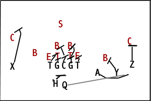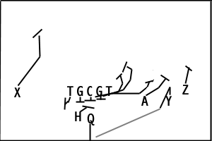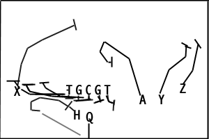 The Wide receiver screen is a personal favorite of mine that we do many times a game with great success. This is a play that has seen increased success and visibility at all levels. The quarterback will drop just as he does on the H screen, and will retreat drawing the defense looking away, and will deliver the ball to the screen receiver after a 5 step drop. The backside receivers will simply run off and try to find someone to hit after a certain depth and selling pass. The running back will simply try to pick up the most dangerous rusher from the linemen that leave. The outside receiver will run up two hard steps and then retrace his steps and begin to come back to the quarterback. He should not get very far in however, and must make sure to be behind the line of scrimmage. Upon catching the ball he must get upfield quickly. The large advantage to the way we do it, and the flexibility we give our blockers, to either reach, come underneath and drive, or kick out the defenders based on where htey are, is it gives our receiver 3 distinctly different paths he can take depending on whatever opens up. It gives you more variation because defenses have different characteristics and adjust differently. The cutback accross the formation happens if the linebackers and safeties way overpursue and the guard and center can come underneath and take those players out of position, but that scenario is rarer. The next closest inside receiver will take one or two hard steps off the line as in a pass route, but then will come underneath and stalk block #1 from the sideline. The onside tackle will immediately release and will try to come underneath and block #2 from the sideline, but can also wall him off and kick him out. The guard and center will pass set up for a one count and then will release and curl up trying to pick up the linebackers/safeties and any other general trash. IN trips, the outside receiver blocks #1 and everything else just moves in one. (the inside man in trips blocks #2 instead of #1, etc.)
